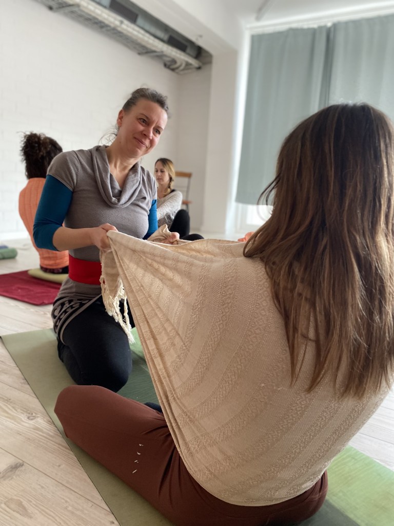 Il se pratique en tenue confortable et le corps est lové dans de longs tissus mexicains qui permettent de bercer, envelopper, étirer et mettre en mouvement le corps selon les besoins.